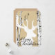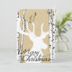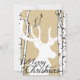 Nature inspired holiday invitation cards feature a tan kraft paper look on both front and back with a white silhouette deer with large antlers in a birch tree forest on front with cursive text that reads Merry Christmas, a small black silhouette antlered deer head on back with areas you can add a personal message and your name!