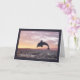 Silhouette dolphin leaping from the ocean in front of a sunset and land with a purple border. Great birthday card for the animal lover. 2014 © Design by Julia Bryant.
