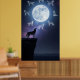 Silhouette of a husky howling on a cliff under a huge full moon revealing the constellations