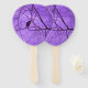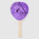 This program hand fan has a silhouette of a single black crow sitting in the branches of barren black trees against a hazy purple sky on the front and back.