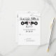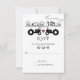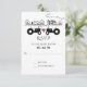 This black and white wedding RSVP card features two silhouette tractors in love. They are set against a charming line drawing country farm. -