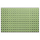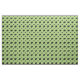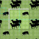 A classic Border Collie crouch keeps a group of four sheep under control. The sheep and dog are solid black - some with fine white outlines. The background is a patterned repeating design of various shades of green vaguely round.
