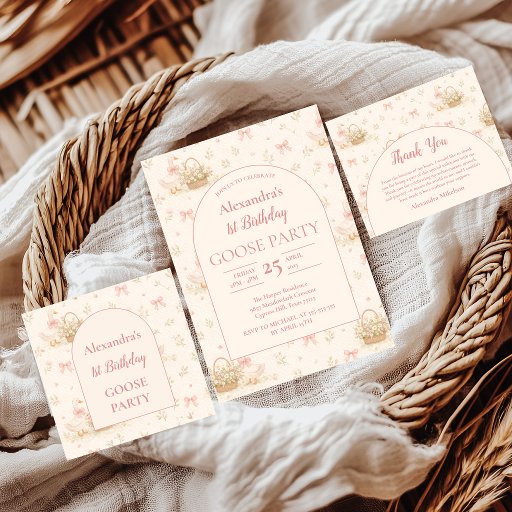 A sweet and whimsical birthday design featuring charming silly goose illustrations, soft florals, and delicate bow accents in a warm blush palette. The arched layout adds a vintage storybook feel, creating a soft and timeless look that’s perfect for a first birthday celebration.