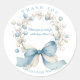 Add a touch of whimsical elegance to your baby shower favors with these Silly Goose Blue Floral Round Stickers. This high-end design features a delicate, circular wreath of watercolor berries and wildflowers in shades of dusty blue and cream. The focal point is a large, beautifully rendered blue ribbon bow, accented with soft gold starlight patterns, giving the labels a boutique, handcrafted feel.