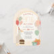 The muted colour palette, including earthy peach, sage green, warm neutrals, and soft yellow, makes this invitation perfectly gender-neutral and suitable for a variety of party styles, from a farmyard celebration to a storybook-themed birthday or outdoor picnic. The arch-shaped design adds a modern and playful touch while maintaining an elegant simplicity.