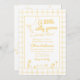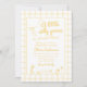 If you looking for an elegant unique and easy customisable gender neutral baby shower invitation this is perfect for you. As you see it features a retro handwritten script of a little silly goose is almost there in pastel yellow. And hand drawn goose on. And yellow border frame and yellow chequered squares. All yellow and on white background. Very easy to customise and use. So grab it and make your invites very engaged.