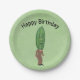 This paper plate is green with a silly man in a brown suit with red tie with a big green pickle for a head that has a face. Customise the Happy Birthday text with the template.