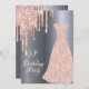 Elegant, classic, glamourous and girly style party invitation. A rose gold dress with faux rose gold glitter drip, paint drip look. Faux silver metallic looking background. With the text: 50th Birthday Party on front written with a modern light grey coloured hand lettered style script.