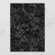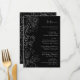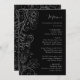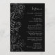 This elegant wedding menu features a delicate floral ornamental design with flowers, birds and leaves on a silver and black background. The text combines handwritten script and serif fonts for a stylish and modern look.