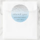 Wedding favours thank you stickers with faux silver glitter design and ombre blue watercolor background.