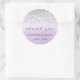 Wedding favours thank you round stickers with faux silver glitter design and ombre purple lavender watercolor background.