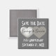 This Save-the-Date refrigerator magnet features two silver hearts overlaid by the names of the bride and groom, the words "Save the Date" above the hearts, and the words "25th anniversary" and the celebration date below. The heart pair design can be customised for an engagement party, bridal shower, rehearsal dinner, wedding, anniversary or valentine's party favour.
