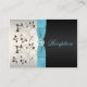 This Silver, Aqua, and Black Floral Reception Enclosure card has an aqua blue PRINTED ribbon and PRINTED diamond jewel brooch that would be perfect for an aqua and black themed wedding. Some of the papers will alter the colour of the design, so use caution if you choose one of the paper types besides the basic white shown here. ALSO, if you re-size the card, or if you change fonts, or the size of the font, some of the design and/or text may get cut-off. Everything will print as you see it on your monitor. I will not see your card, and Zazzle will NOT correct anything (typos, mis-alignment etc.). The text and paper is all customisable. If you need help with this card, please email me BEFORE you place your order. If you require any other matching items, please email your request to niteowlstudio@gmail.com