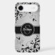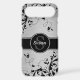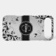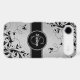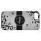 Fun, yet professional, this Personalised Silver Brushed Steel photo and Black floral swirls printed on a plastic iPhone 5 Case-Mate Case is a great way to accessorise your cell phone. Make a fashion statement with your monogram initial and name on a circular tag with a black line on a floral swirls pattern and a solid silver background all printed on this hard shell girly iPhone 5 case.