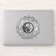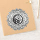 A detailed mandala featuring a yin-yang symbol in the center surrounded by floral patterns. The grayscale palette adds depth and contrast.