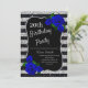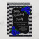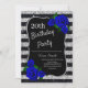 Elegant silver and black stripes glitter and deep blue roses birthday party invitation for women of any age. The age can be changed for any age. Text can be changed to anything to fit your event. Fonts, font colour and text are completely customisable! Paper shape and type can be customised to fit your budget and taste!