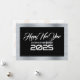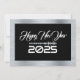 Greeting wish card Happy New Year written in English in white font with golden sound wave on a silver and black background - editable text and background