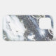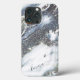 Elegant feminine calligraphy script personalised name modern iPhone case on a white blue grey marble stone with silver glitter sparkle accents.