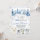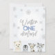 Sweet boy's winter onederland birthday invitation featuring four cute arctic animals, a faux silver calligraphy heading with a blue watercolor word, snowflakes and a winter landscape in blue. This boy's winter onederland birthday invitation is sure to set the scene for a boy's onederland first birthday party.