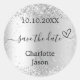 A Save the Date sticker for your wedding. A faux silver looking background, black text. Decorated with confetti and a small heart.