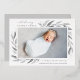 Elegant botanical birth announcement in chic pastel colours features a single full bleed horizontal or landscape orientated photo with clusters of delicate pale grey watercolor leaves at the corners, accented with silver foil. Personalise with baby's name, birth stats, and a personal message, and add three additional square photos to the back.