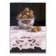 An oil painting in the dutch style depicting walnuts in a silver bowl on a cut-work tablecloth.