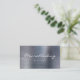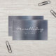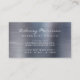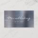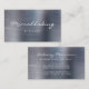 This elegant modern business card features a background image of silver faux brushed metal foil. The word "Microblading" appears on the front of the card in white handwriting script. Personalize it with your name in white sans serif font and your contact information on the back.