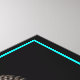 A silver Buddha head statue reflecting on black water filled with floating turquoise lotus flowers and green lily pads. Surrounded by a blue turquoise border and a black background.