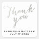 The words "Thank You" in faux silver foil calligraphy script on white background. Wedding Favour Label Sticker. Printed Faux Silver Foil Photo Effect. Elke Clarke ©