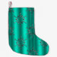 A merry and bright Christmas stocking in teal and silver, with silver Christmas stars (of silver metallic snowflakes) spread over a colourful, metallic teal background to add some style and class to your mantelpiece for the holidays this year.