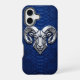 Experience the power of precision. This luxury iPhone 16 case features a magnificent metallic silver geometric ram head with detailed spiraling horns in a 3D chrome style. The modern industrial aesthetic is perfectly set against a premium cobalt blue python snakeskin texture. A bold statement piece for those who value leadership, determination, and high-end minimalist art. Designed to provide a sophisticated and protective armor for your tech.
