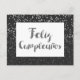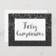 Modern Spanish birthday postcard with a silver and black confetti background and Feliz Cumpleanos in a silver glitter design. Please note there is not actual glitter, but a glitter design effect.