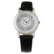 Two circles, a small one with Roman numerals on and a larger faux silver one with circles on which analogue numbers appear are framed by delicate black swirls