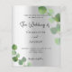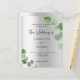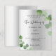 A modern, elegant and minimalist wedding invitation. Faux silver looking background decorated with eucalyptus greenery, sprigs. Personalise and add your names and wedding details. Black coloured letters.