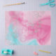 Beautiful tissue paper design featuring hand drawn silver henna ornaments on an abstract pink and turquoise background.