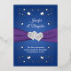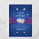 This romantic wedding invitation has real silver foil floral arches above and below a PRINTED ON purple ribbon and simulated silver glitter and crystal joined heart brooch across the centre of a royal blue background. The names of the happy couple appear in white above the ribbon, with the customisable verse below the ribbon that says, "Two lives, two hearts, Joined together by friendship, United forever in love". The back side of the invitation is grey with a royal blue decorative scroll and floral frame around the wording that is in blue and purple with the same pair of double hearts at the top back between the floral arches. There are also RSVP details on the back of the invitation, making this an affordable, yet luxurious wedding invitation that is sure to enchant your wedding guests.