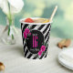 Celebrate in style with this unique Sweet Sixteen paper cup design featuring a large, faux foil 'Sweet 16' in silver and hot pink. The solid black background is topped with diagonal stripes in the same silver foil effect with lush hot pink roses around an oval frame. If preferred, the eye-catching 'Sweet 16' is optional and can be deleted to use this template for other occasions. Use the provided template to customise your name and birthdate. Search ID759 to see other products and colour options for this design.