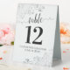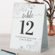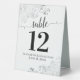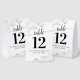 These beautiful table tent signs will make it easy for your guests to find their tables at your wedding reception. The elegant black and white design features lacy script calligraphy with ornate floral curls and swirls in the corners. There is space for the names of the couple and the wedding date.