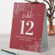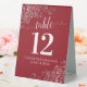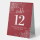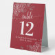 These beautiful table tent signs will make it easy for your guests to find their tables at your wedding reception. The elegant red design features lacy script calligraphy with ornate floral curls and swirls in the corners. There is space for the names of the couple and the wedding date.