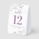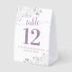 These beautiful table tent signs will make it easy for your guests to find their tables at your wedding reception. The elegant lavender and white design features lacy script calligraphy with ornate floral curls and swirls in the corners. There is space for the names of the couple and the wedding date.