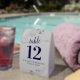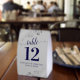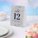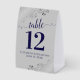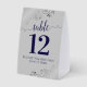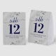 These beautiful table tent signs will make it easy for your guests to find their tables at your wedding reception. The elegant navy blue and grey design features lacy script calligraphy with ornate floral curls and swirls in the corners. There is space for the names of the couple and the wedding date.