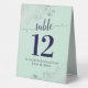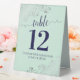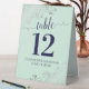 These beautiful table tent signs will make it easy for your guests to find their tables at your wedding reception. The elegant navy blue and neo mint green design features lacy script calligraphy with ornate floral curls and swirls in the corners. There is space for the names of the couple and the wedding date.