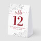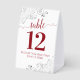 These beautiful table tent signs will make it easy for your guests to find their tables at your wedding reception. The elegant red and white design features lacy script calligraphy with ornate floral curls and swirls in the corners. There is space for the names of the couple and the wedding date.