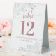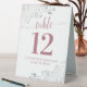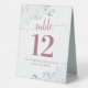 These beautiful table tent signs will make it easy for your guests to find their tables at your wedding reception. The elegant dusty rose and white design features lacy script calligraphy with ornate floral curls and swirls in the corners. There is space for the names of the couple and the wedding date.