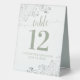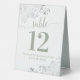 These beautiful table tent signs will make it easy for your guests to find their tables at your wedding reception. The elegant sage green and white design features lacy script calligraphy with ornate floral curls and swirls in the corners. There is space for the names of the couple and the wedding date.