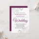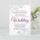 This wedding invitation features a simple yet elegant design with cassis purple or magenta and grey script lettering on a white background. The simplicity of the design is offset by the silver faux foil frills in the corners. The fancy filigree is ornate and floral and provides a nice contrast with the understated text. The wording is formal and traditional, but the chic layout makes it look modern and accessible.