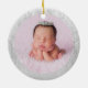 A modern bold name and date in white with a black drop shadow on a round ceramic ornament.
