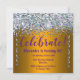 This golden, glittering 40th birthday party invite features a pattern of (please note, only printed) sparkling silver glitter and silver curling ribbons hanging down on a shiny gold background. Please note, all details can be easily personalised to suit, including the age and event which can be changed to 50th, 30th birthday, 50th anniversary, etc. if needed. The other side of the invite is a solid silver glitter.
