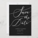 Elegant and simple wedding save the date card. The hand lettered typography text is in faux silver glitter on a black background.