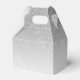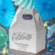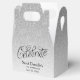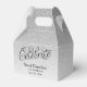 This beautiful favour box features faux silver ombre glitter and your custom text along with the word Celebrate in fancy script. Use the template form to add your information. The Customise feature can be used to change the font and the text layout. You can also add text to the other side of the favour box.